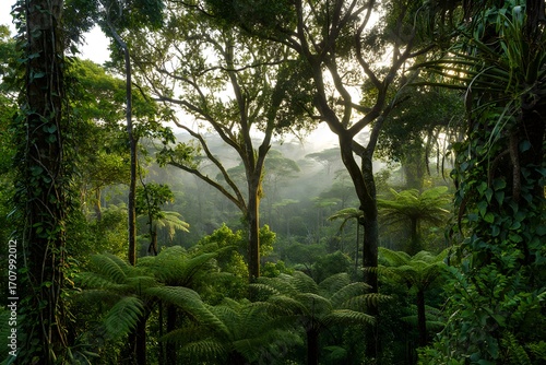 © Monowara, Fototapeta premium Sunlight streams through the lush green leaves of a tropical rainforest, illuminating a serene view of palm trees and other plants