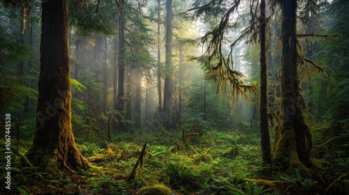 Obraz premium Sunlight streams through the misty trees of a lush, green forest.