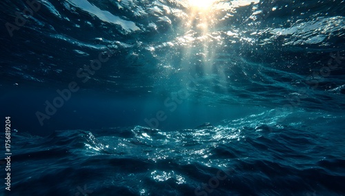 © Kdhtdg, Obraz premium Sunlight streams through the ocean surface illuminating the deep blue water with shimmering light rays creating a serene and tranquil underwater scene