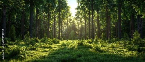 Obraz premium Sunlight streams through the tall trees, illuminating the lush green forest floor below beautifully.