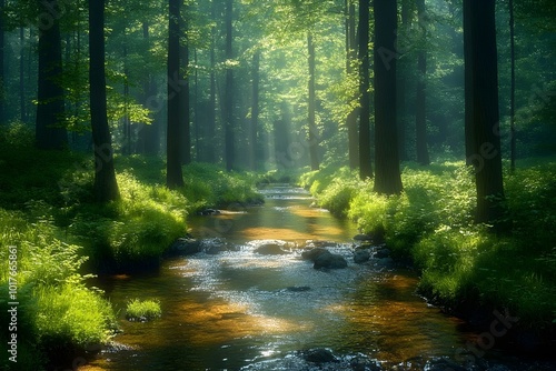 Fototapeta premium Sunlight streams through the trees, illuminating a tranquil creek winding...