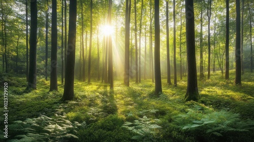 © Zidan, Obraz premium Sunlight streams through the trees of a lush green forest, creating a magical atmosphere.