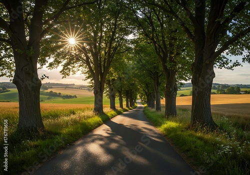 Obraz premium Sunlight Streams Through Tree Lined Country Road at Golden Hour.