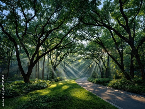 Obraz premium Sunlight streams through trees