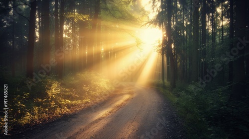 © olegganko, Obraz premium Sunlight Streams Through Trees Along a Forest Path in Morning Light