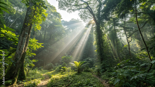 Fototapeta premium Sunlight streams through trees in a dense forest during morning hours revealing lush greenery and natural beauty
