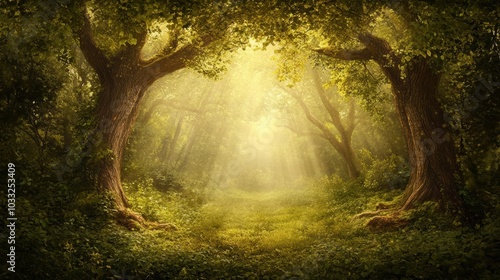 © Ali, Obraz premium Sunlight streams through trees in a forest.