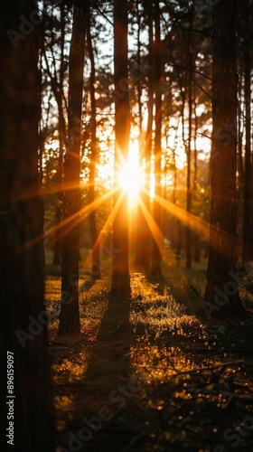 Obraz premium Sunlight streams through trees in a forest at sunset