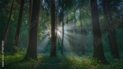 © AngurHussain, Obraz premium Sunlight streams through trees in a forest, creating a magical atmosphere