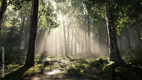 Obraz premium Sunlight streams through trees in a serene forest setting during early morning hours, highlighting the lush greenery and tranquil pathway