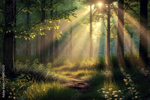 © Cedric, Fototapeta premium Sunlight Streams Through Trees in Lush Green Forest