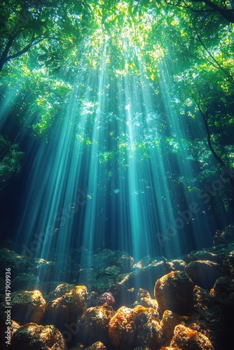 © atik, Fototapeta premium Sunlight streams through trees onto rocky underwater scene.