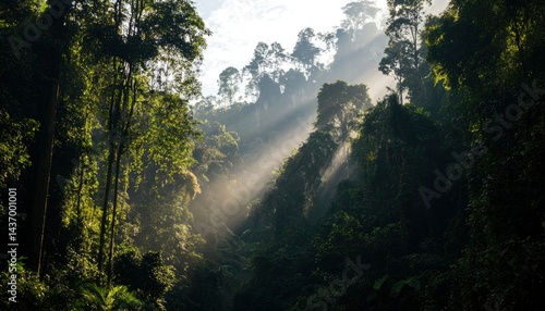 Obraz premium Sunlight streams through tropical forest