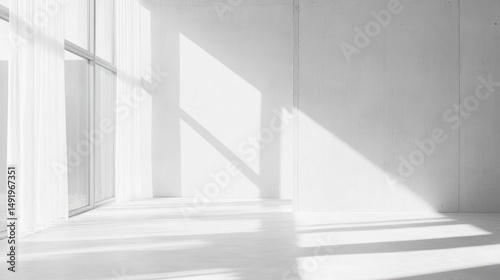 Fototapeta premium Sunlight streams through window in bright white minimalist room.