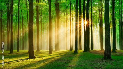 Fototapeta premium Sunlight Sunrise Streaming Through Forest Trees