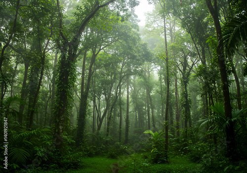 © Rifqi Zakiri, Obraz premium Sunlight Through Canopy in Dense Tropical Rainforest with Mist and Vines