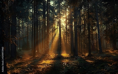 Naklejka premium Sunlight Through Dark Forest Trees - Golden Hour in Woods