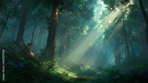 © Viktor, Obraz premium Sunlight through dense forest canopy. AI generated