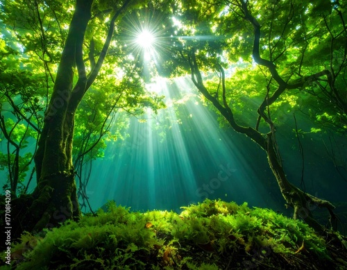 © Diki prayoga, Fototapeta premium Sunlight Through Forest Canopy - A Serene Natural Scene.