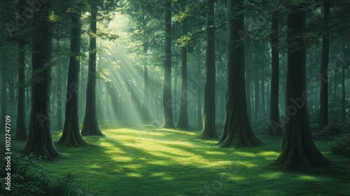 © akhmad, Obraz premium Sunlight Through Forest Trees
