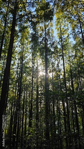 Obraz premium Sunlight through forest trees 숲 속 나무 사이로 비치는 햇살
