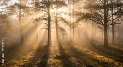 © PakRete, Obraz premium Sunlight through forest trees creating atmospheric landscape scene