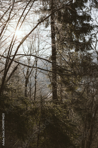 Fototapeta premium Sunlight Through Frosty Winter Forest Trees