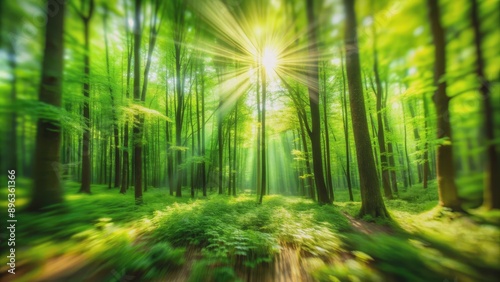 Naklejka premium Sunlight Through Green Forest, Motion Blur, Nature Photography, Sunbeams,...