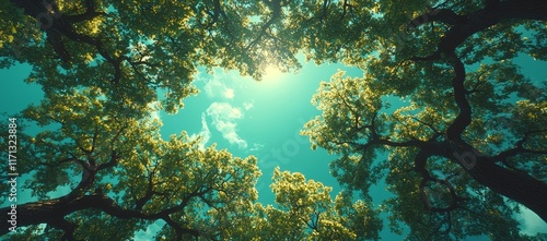 Fototapeta premium Sunlight through lush green canopy of trees.