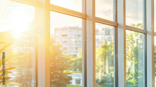 © Narongsag, Naklejka premium Sunlight Through Modern Window With Blurred Cityscape View