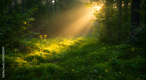 © egavirgian art, Naklejka premium Sunlight through the forest illuminates the green grass and yellow flowers