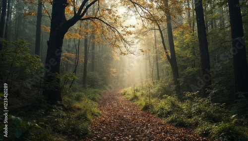 © Aimag, Naklejka premium Sunlight through the trees in a misty forest. Concept of tranquility, peace, and nature.