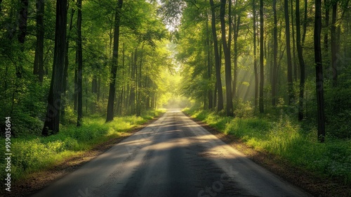 Fototapeta premium Sunlight through the Trees on a Winding Forest Road