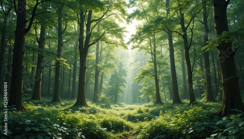 Obraz premium Sunlight through trees forest nature photography lush environment eye level serenity