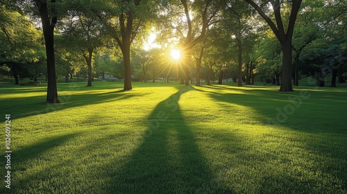 © Sandu, Obraz premium Sunlight Through Trees in Green Park