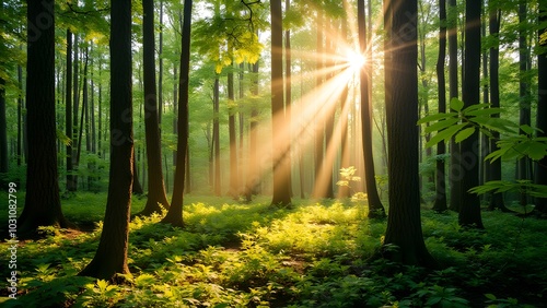© Sasiyapa, Obraz premium Sunlight Through Trees in Lush Green Forest