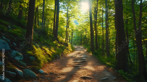 © embun, Obraz premium Sunlight Through Trees on a Forest Path Illustration