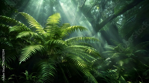 Obraz premium Sunlight Through Tropical Ferns in a Lush Rainforest
