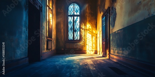 © atar, Fototapeta premium Sunlit Abandoned Building Interior