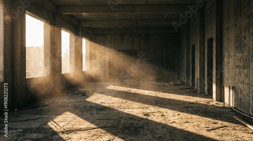 © IbragimovN, Obraz premium Sunlit abandoned building interior captured in warm glow