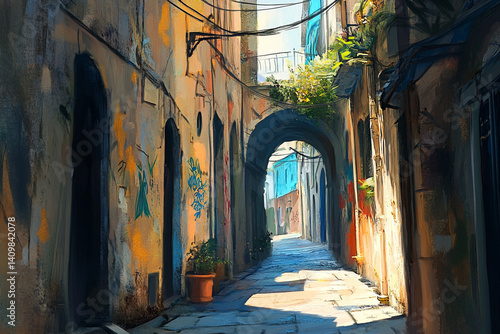 © Tohamina, Fototapeta premium Sunlit Alleyway Charming Old World Architecture Graffiti Art