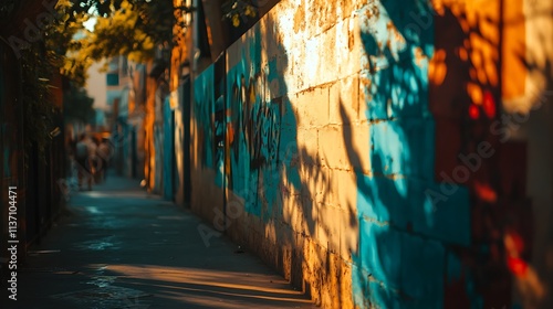 © siyons, Fototapeta premium Sunlit Alleyway Wall Graffiti Urban Scene