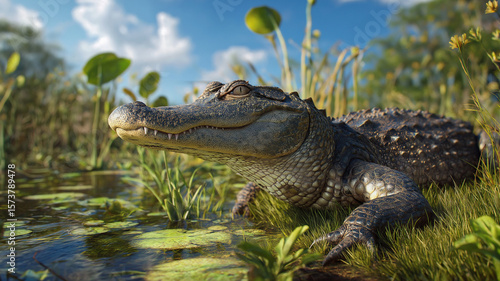 Obraz premium Sunlit Alligator Resting in Wetland – Everglades Reptile and Ecosystem