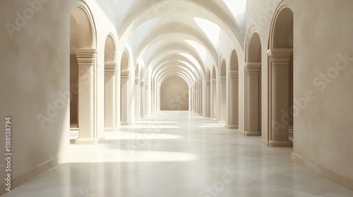 Fototapeta premium Sunlit arched hallway with marble floor and columns.