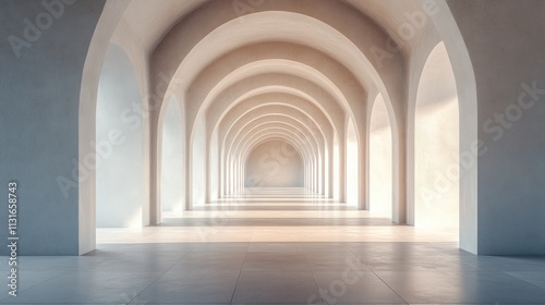 Fototapeta premium Sunlit arched hallway with vanishing perspective.