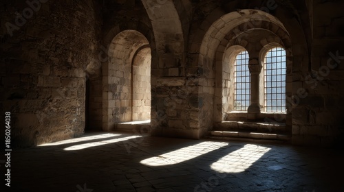 Fototapeta premium Sunlit arched windows cast dramatic shadows inside an empty ancient room,...