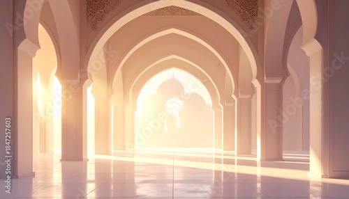 Obraz premium Sunlit Architectural Corridor with Arched Entryways and Intricate Patterns...
