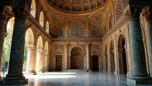 Fototapeta premium Sunlit Architectural Marvel A Serene Colonnaded Hall with Intricate Carvings...
