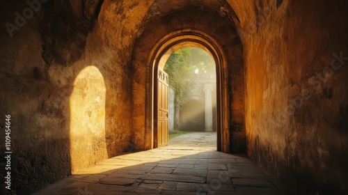 Fototapeta premium Sunlit archway leads to tranquil garden.