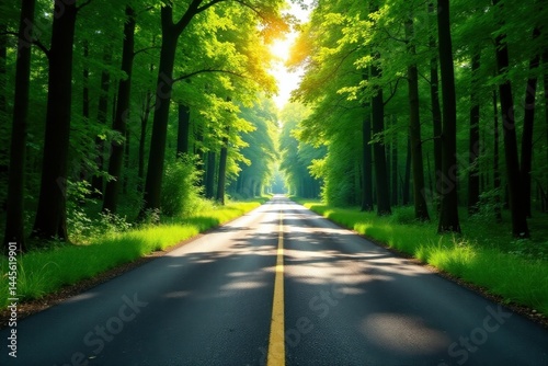 Fototapeta premium Sunlit Asphalted Road Through Lush Green Forest Canopy
